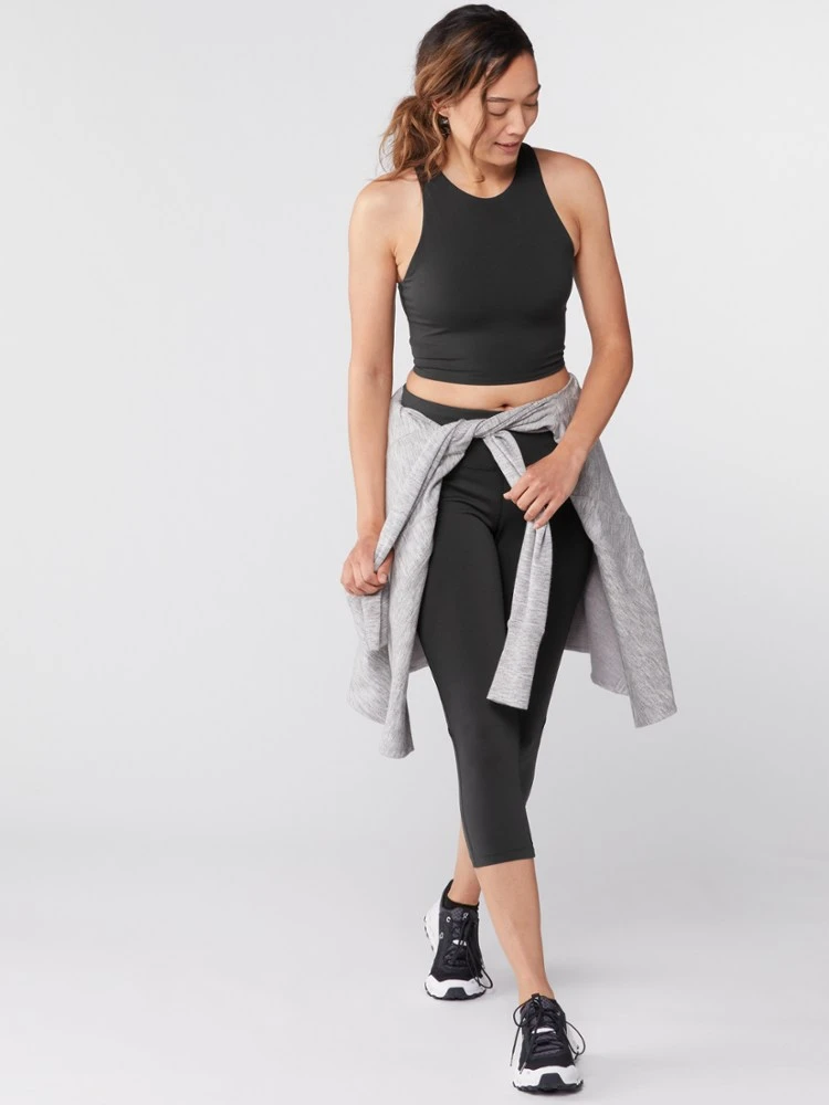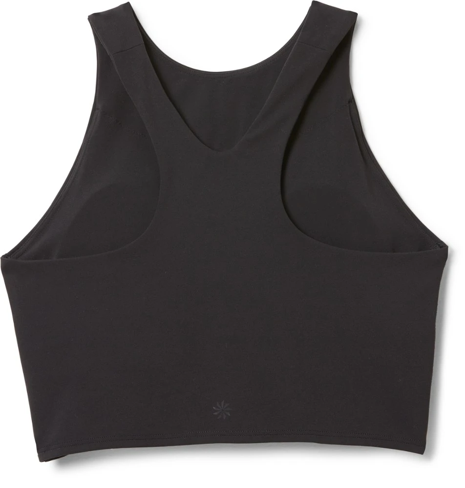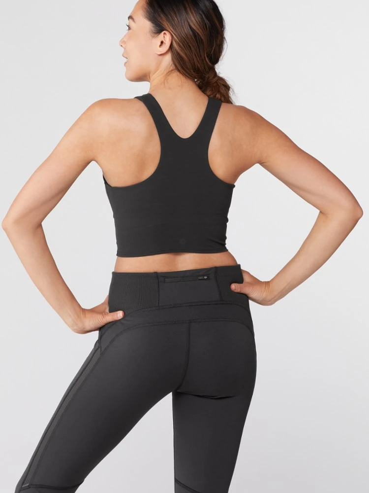 - High-coverage crop silhouette and racerback design provide airflow and mobility